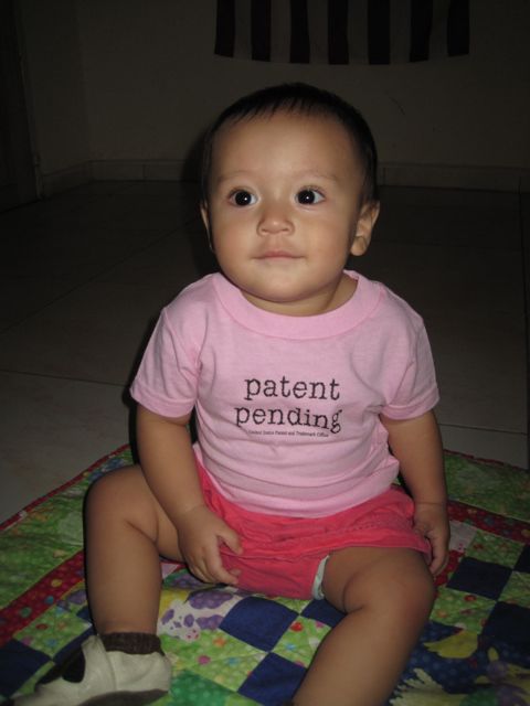 Abigail, already 9 months old! She is pulling to stand, holding her own bottle, and feeding herself finger foods!! (She is wearing a shirt that her Uncle Josh got for her at the “patent office” from home)